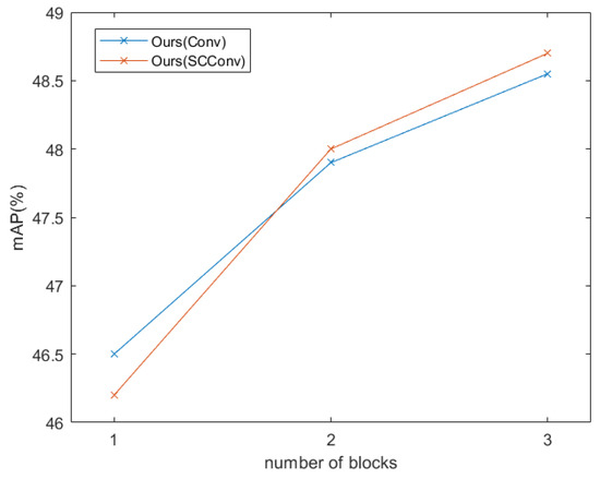 Relationship between the number of collaborative blocks used in the proposed model and the achieved mean average precision (mAP), demonstrating the positive impact of adding blocks on detection performance.