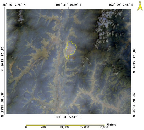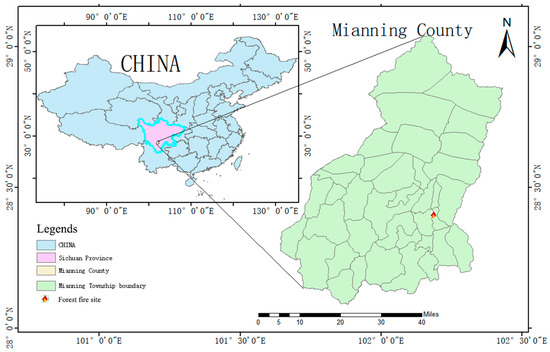 A forest fire that occurred in Mianning County (referred to as the Mianning fire in this paper) in Sichuan Province in China in April 2021 was used to compare the accuracy of the RS-enabled forest fire prediction. Mianning is located in the northeastern part of the Liangshan Yi Autonomous Prefecture, between the latitudes of 28°5′N and 29°2′N, and longitudes of 101°38′E to 102°19′E, as shown in Figure 1. Mianning County has a forest cover rate of 34.7%, which is rich in different species, including a total of 140 families, 341 genera, and 608 species of trees, shrubs, and herbaceous plants. It is situated in the middle of the Hengduan Mountains and features a complex terrain and significant elevation differences, with a high mountain canyon area that fosters a unique dry–hot valley climate. The time from March to May every year is the dry–hot season. In the three months before the arrival of the main southwest monsoon in June, it is both dry and hot, making it highly susceptible to forest fires. Once a forest fire occurs in such a place, it is often on a high-altitude region with a steep terrain, and the wind direction on the mountain can change abruptly, making firefighting dangerous and arduous due to the interplay of monsoons, mountain winds, and valley winds with high-altitude airflows. Therefore, the real-time and accurate remote sensing monitoring of forest fires is urgently and vitally important for guiding emergency fire responses and scientific firefighting efforts.