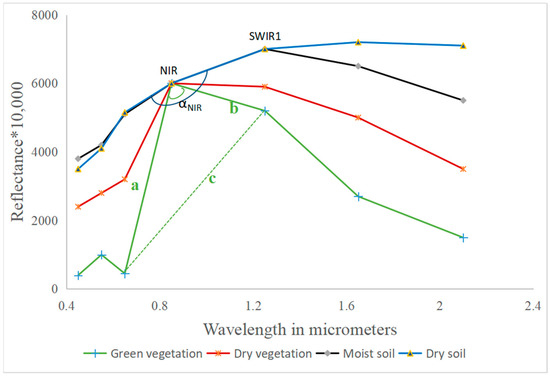 The angle formed at the NIR by the reflectance at bands red, NIR, and SWIR1. An additive offset was applied to make spectral values equal at the NIR band (adapted from Shruti Khanna et al. [12]).