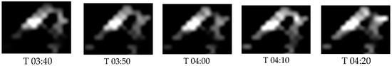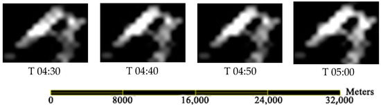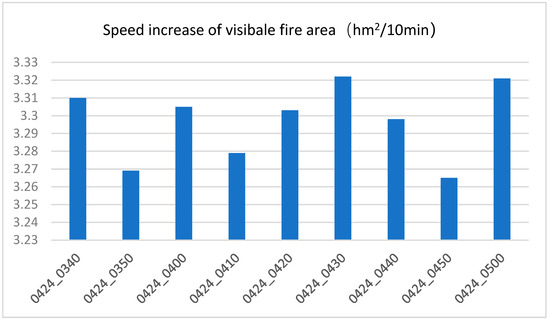 According to the hourly meteorological data for Mianning County on 24 April 2021, shown in Table 3, between T4:00 and 5:00, the wind direction and speed changed from north at 1.44 m/s and east at −0.78 m/s to north at 1.48 m/s and east at −0.54 m/s, indicating relatively stable conditions. Based on the maximum spread distances in each direction, shown in Table 9, the average increase in the visible fire area was calculated to be 3.257 hm2/10 min (square hectare per 10 min) within one hour. The analysis of the dynamic changes in the visible fire area of the Mianning forest fire monitored by the Himawari-8 satellite every 10 min from 24 April 2021 T03:40 to 24 April 2021 T05:00 (UTC) (Figure 14) shows a significant increase in the visible fire area, with an average increase rate of 3.297 hm2 per 10 min. This rate can be considered consistent with the results achieved by the RS-enabled forest fire spread model. The small discrepancy may be likely due to the differences in the spatial resolution between remote sensing images. The traditional forest fire spread simulation model predicted an average increase in the open flame area of 3.5637 hm2 per 10 min. This shows a significant discrepancy when compared to the actual monitoring results.