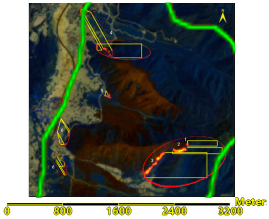 Overlaid results of the abnormal brightness temperature boundary and the predicted forest fire spread area (the green line indicates the abnormal brightness temperature boundary; the yellow line indicates the forest fire spread area).