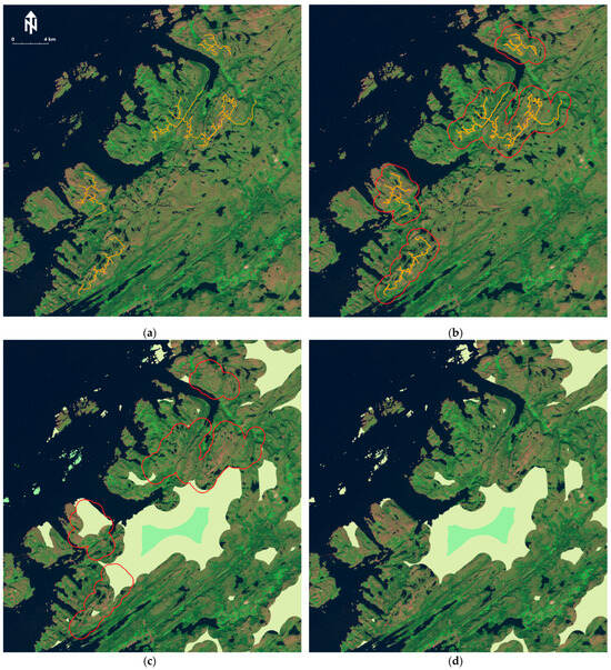 Steps for updating the map of undisturbed nature. (a) New roads (orange) in the new windmill parks in the Åfjord municipality, Trøndelag County, Norway, superimposed on a 25 km by 25 km part of the Sentinel-2 tile T32WNS of 30 July 2019. (b) 1 km buffer zones around the new roads (red), (c) areas of undisturbed nature (white and mint green) and buffer zones for new roads (red). (d) Remaining areas of undisturbed nature after subtracting the overlaps with the buffer zones.