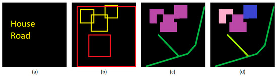 Different types of image detection tasks. (a) Image classification. (b) Object detection, with red bounding boxes indicating roads and yellow bounding boxes indicating houses. (c) Semantic segmentation, with roads indicated in green and houses indicated in purple. (d) Instance segmentation, with each object instance in a different colour.