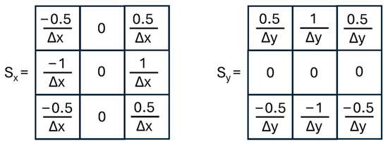 The gradient in the east direction, Gx, is obtained by convolving the DTM image with the vertical Sobel edge detector Sx, while the gradient in the north direction, Gy, is the result of convolving the DTM with the horizontal Sobel edge detector, Sy. The constants Δx = Δy = 10 m are the grid cell distances in the east and north directions, respectively, of the DTM.
