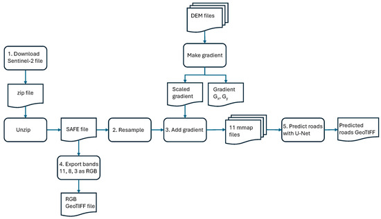 Data flow diagram for the processing chain for a single Sentinel-2 file, resulting in two GeoTIFF raster files: (1) a false-color RGB image and (2) a binary image with predicted roads.