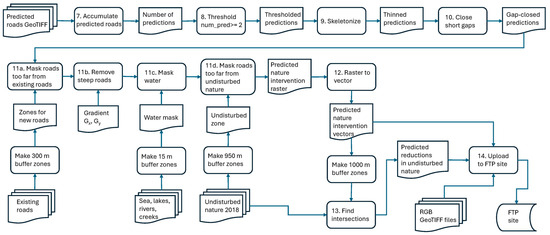 Data flow diagram for the processing chain for merging all single-date road predictions for the same Sentinel-2 tile and applying several post-processing steps to produce two vector files: (1) predicted nature interventions that will reduce the area of undisturbed nature and (2) predicted reductions in undisturbed nature. The last step is to upload the two vector files plus false-color RGB images of all the contributing Sentinel-2 images to an FTP site.