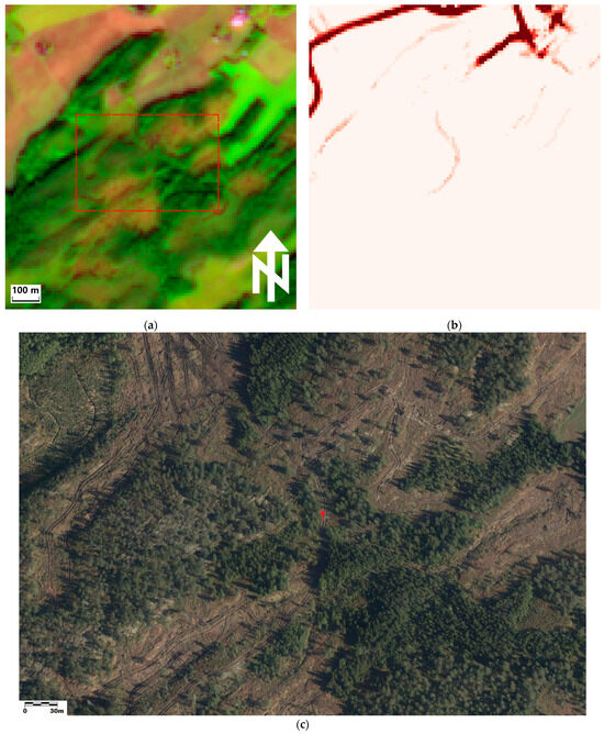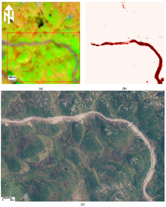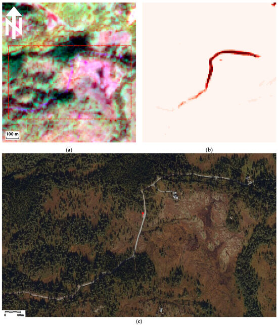 Predicted new road at 65.83403551 degrees north, 13.09592566 degrees east, at Middagseidklumpen in the Vefsn municipality, Nordland County. (a) Sentinel-2 image from 28 August 2021 in false colors. (b) Accumulated predictions, with dark colors indicating the predictions at several acquisition dates. (c) Air photo from 28 August 2021, with red a needle indicating the coordinate position. The extent of (c) is indicated with a red rectangle in (a).