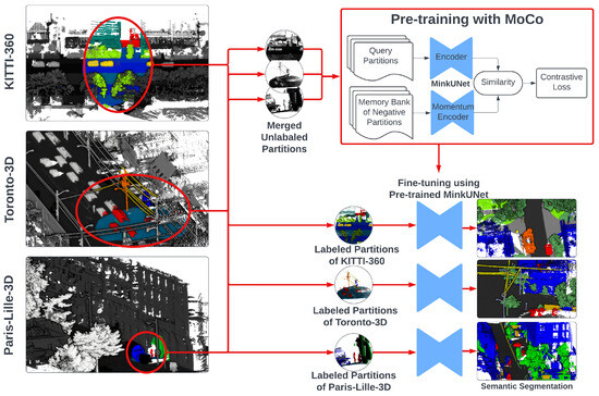 - Jiang, L.; Shi, S.; Tian, Z.; Lai, X.; Liu, S.; Fu, C.W.; Jia, J. Guided point contrastive learning for semi-supervised point cloud semantic segmentation. In Proceedings of the IEEE/CVF International Conference on Computer Vision, Montreal, BC, Canada, 11–17 October 2021; pp. 6423–6432. [Google Scholar]