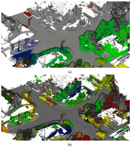 Segmentation of the KITTI-360 dataset (a) without the proposed data augmentation and (b) with the proposed data augmentation. The ground segment, computed using RANSAC, is displayed in gray. All the other segments, computed using the DBSCAN algorithm, are shown in colors other than gray.