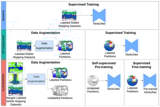 A comparative study was conducted to demonstrate the feasibility of self-supervised contrastive learning on mobile mapping datasets. We utilized the proposed data augmentation method and examined the benefits of leveraging merged heterogeneous datasets. This study involved three learning strategies. The first one, called Baseline, is a supervised baseline with MinkUNet [28] trained with aggregated point clouds. MinkUnet was chosen because it is the network used in the SegContrast pipeline. The second, called DA-supervised, is the same supervised network as the Baseline but trained with partitions from the aggregated point clouds computed using the proposed data augmentation method. The third, called CLOUDSPAM, is our adaptation of SegContrast. Thus, it consists of self-supervised pre-training with MoCo using unlabeled partitions from the merged heterogeneous datasets, followed by supervised fine-tuning using labeled partitions from the aggregated point clouds of the targeted dataset using the proposed data augmentation method. The three learning strategies are shown in Figure 4. The first aim of this comparative study is to highlight the improvement brought about by diversity-rich labeled data using the proposed data augmentation approach in the context of supervised learning. Secondly, it aims to demonstrate the ability of the contrastive approach conditioned by our adaptations in comparison with that of the supervised approach. The three learning strategies are outlined as follows:
