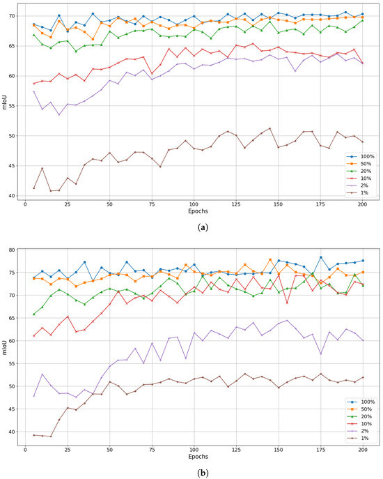 Comparison of mIoU (%) scores of CLOUDSPAM per epoch of pre-training for each of 6 data regimes on (a) the test set of the Toronto-3D dataset and (b) the validation set of the Paris-Lille-3D dataset.