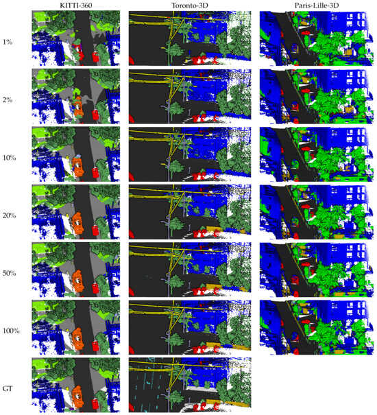 MinkUNet is used was the backbone architecture for all experiments. MinkUNet works with sparse voxels thanks to its Minkowski engine [28] and requires voxelization of the point space. A voxel size of 5 centimeters was selected for all experiments. In order to input the point clouds into MinkUNet for the classical supervised baseline, we did not apply any data pre-processing other than the default MinkUnet voxelization and random selection. A value of 600K was chosen for the random point selection of MinkUNet, with a batch size of 2 in all of the baseline experiments. For the Paris-Lille-3D and Toronto-3D datasets, each point cloud was divided into sub-clouds of around 2 million points. For each of the learning strategies, the supervised phases were implemented using the following six labeled data regimes: 1%, 2%, 10%, 20%, 50%, and 100% availability of labeled data. As a result, 6 experiments were carried out for each of the three datasets and each of the three learning strategies, for a total of 54 experiments. In KNN point selection in the data augmentation approach, a K value equal to 131,072 (217) was chosen to generate partitions representing scene with diverse classes. This value is also close to the average number of points per scan in datasets such as SemanticKITTI [7]. DBSCAN segmentation uses two parameters—namely, Epsilon, a distance measure used to locate the points in the neighborhood of any point, and the minimum number of points clustered together for a region to be considered dense. Different combinations of values were tested to maximize the purity of segments, as well as the total number of segmented points. Here, purity refers to the property of a segment only containing points from one class. Selecting 0.25 for Epsilon and 10 for the minimum number of points yielded the best results. For self-supervised pre-training, a learning rate of 0.12 was used, and for all of the supervised training and fine-tuning experiments, a learning rate of 0.24 was chosen. All experiments were performed using an NVIDIA V100 Volta graphics card.