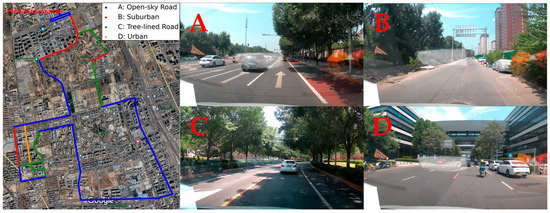 As shown on the left side of Figure 3, the experimental route is located in Haidian District, Beijing, with a total length of 20.6 km, taking approximately 41 min to complete. Based on the actual driving conditions and the classification in the literature [36], we categorized the driving environment into four types: open-sky road (A), suburban (B), tree-lined road (C), and urban (D) environments, represented on the map in blue, red, green, and yellow, respectively. In our complex scenarios, the roads are narrower, and there are more obstructions. The definitions are shown in Table 3: