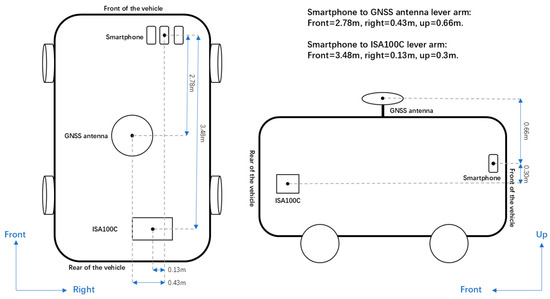 The schematic diagram of the in-vehicle experimental setup. The lever arm of the smartphone to GNSS antenna is front = 2.78 m, right = 0.43 m, and up = 0.66 m; the lever arm of the smartphone to ISA100C is front = 3.48 m, right = 0.13 m, and up = 0.3 m.