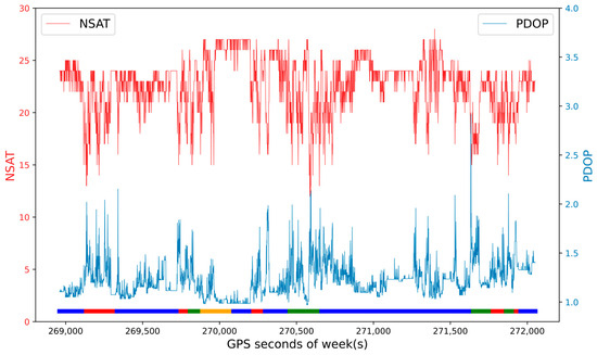 Number of satellites and PDOP values for the S21 on the test route. The color blocks located at the bottom of the image represent changes in environmental scenes: blue, red, green, and yellow correspond to open-sky road (A), suburban (B), tree-lined road (C), and urban (D), respectively.