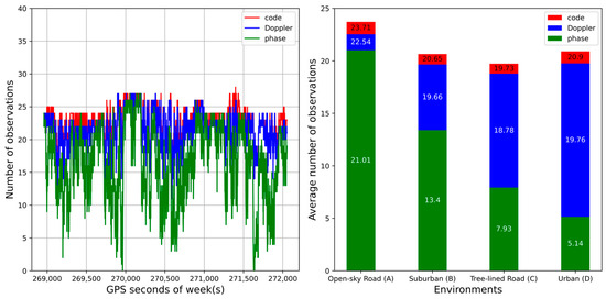 The number of code (red), Doppler (blue), and phase (green) observations recorded by the S21 smartphone along the experimental trajectory (left); the average number of each observation type in open-sky road (A), suburban (B), tree-lined road (C), and urban (D) environments (right).