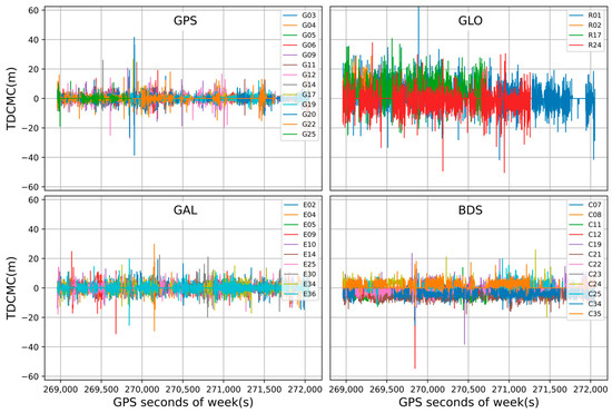 While the number of code observations remains relatively consistent across varying conditions, their quality can be substantially degraded in high-multipath environments. To further investigate the impact of multipath along the test route, TDCMC values were calculated for GPS, GLONASS, Galileo, and BDS. TDCMC is an effective metric for describing the impact of multipath effects, cycle slips, and noise on observation quality, as outlined in [38]. As shown in Figure 7, the TDCMC results for individual satellites are represented by different colors, offering insights into the multipath dynamics across different environments. The code observations are clearly susceptible to multipath effects, with TDCMC values reaching 40–60 m in urban environments, indicating degraded code quality due to multipath interference. Among the four GNSSs, GLONASS exhibits the highest TDCMC values, reflecting the poorest code quality compared to the others. The average TDCMC values for GPS, Galileo, and BDS are 1.44 m, 2.05 m, and 3.41 m, respectively, while GLONASS has an average TDCMC of 7.00 m. This demonstrates that GLONASS is significantly noisier than the other systems, highlighting the need for careful system weighting in multi-GNSS combinations to optimize performance.