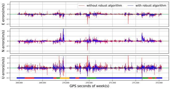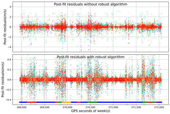 Given the high sensitivity of observations in smartphones to multipath effects, employing effective and robust outlier detection strategies during positioning or velocity estimation becomes crucial. Figure 8 shows the distribution of post-fit residuals during Doppler-based velocity estimation using S21, with and without the use of a robust algorithm. The upper data reveal that in multipath environments without outlier detection, Doppler is highly susceptible to interference. By applying a robust algorithm, post-fit residuals in dynamic high-multipath environments can be controlled within 0.4 m/s, and within 0.05 m/s in low-multipath environments. Additionally, the use of robust processing results in cleaner data, playing a significant role in improving estimation accuracy, particularly in high-multipath environments. Further details on the benefits of adopting robust outlier detection strategies will be explained in Section 4.2.