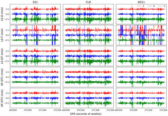 Time series of velocity errors for the S21, CL8, and AD11 using LS-D, LS-T, LS-DT, KF-DT1, and KF-DT2 solutions. The red, blue, and green lines represent the velocity errors in the E, N, and U directions, respectively. Here, the velocity errors in the E and U directions are presented with y = 2.5 and y = −2.5 as the respective reference baselines for the vertical axis.