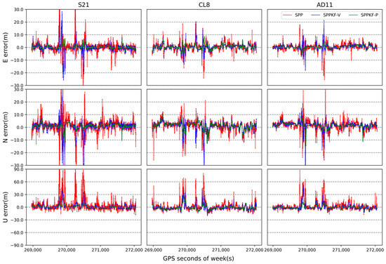 Error plots for the S21, CL8, and AD11 in the E, N, and U directions using the SPP (red), KFSPP-V (blue), and KFSPP-P (green) solutions.