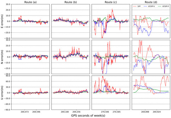 To further analyze the performance of the KFSPP-P strategy in different observation environments, we selected representative sections of the route that correspond to four typical environments: open-sky road (A), suburban (B), tree-lined road (C), and urban (D) environments, as shown in Figure 12. Route (a) represents a relatively open main road with light tree coverage on both sides with a total length of 1.5 km; route (b) is a suburban road with typical suburban characteristics with a total length of 2.8 km; route (c) is a main road heavily covered by trees on both sides with a total length of 1.7 km; and route (d) is a typical urban environment with 5–10 m wide urban overpasses and tall buildings on both sides, with a total length of 0.8 km. Using the S21 smartphone as an example, Figure 13 illustrates the positioning errors of the SPP, KFSPP-V, and KFSPP-P strategies in the four routes (a, b, c, and d), with red, blue, and green lines representing the SPP, KFSPP-V, and KFSPP-P strategies, respectively. From the figure, two key conclusions can be drawn. Firstly, as the observation environment shifts from open-sky to urban environments, the positioning accuracy of all strategies decreases. For instance, the horizontal accuracy of the KFSPP-P strategy remains within 5 m in route (a), but decreases to within 10 m in route (d). Secondly, the KFSPP-V and KFSPP-P strategies perform similarly in route (a) and route (b). However, as the vehicle enters route (c) and route (d), the KFSPP-V strategy experiences significant divergence, while the KFSPP-P strategy maintains robust positioning accuracy.