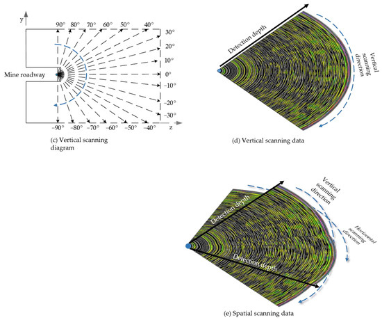 - Significant expansion of detection range: As illustrated in Figure 3a,b, there is no need to deploy survey lines above the mining working face for wall-attached detection, thereby removing spatial constraints imposed by the working face. By utilizing the spatial scanning system, comprehensive coverage from −90° to 90° in both horizontal and vertical directions (as shown in Figure 4a,d) can be achieved, facilitating the exploration of nearly all potential detection areas along the mining direction.