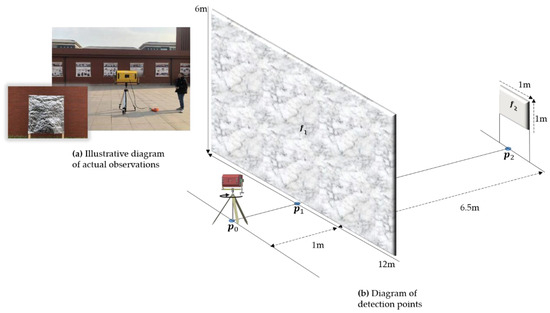 To investigate the response characteristics of the proposed method and the imaging principles, simulated detection experiments were conducted at the South Plaza of China University of Mining and Technology (Beijing) Shahe Campus. In this experiment, as shown in Figure 5, two detection targets, and , were set up to simulate the spatial distribution of mining faces and planar geological structures. Specifically, was a solid wall, made of solid brick and concrete with dimensions of 6 m height, 12 m width, and 0.5 m thickness; while was tin foil with dimensions of 1 m height, 1 m width, and 0.002 m thickness. The targets and were arranged in parallel with a separation of 6.5 m between them. The antenna was positioned at point , 1 m away from target , with its radiation plane initially forming a perpendicular relationship with the planes of targets and . During the experiment, the antenna rotates clockwise (as shown in Figure 4a) with the vertical rotation angle fixed at 0°. The horizontal rotation occurs at intervals of 0.2°, covering a horizontal space from −90° to 90°. Additionally, the radar antenna is a 100 MHz shielded enhanced antenna from China University of Mining and Technology (Beijing), designed with explosion-proof capabilities for underground coal mines. The antenna operates at a central frequency of 100 MHz with a sampling frequency of 100 kHz, utilizing 1024 sampling points and a minimum sampling interval of 5 ps. The antenna’s preamplifier provides a gain of 48 dB. Notably, the radar antenna supports both single-point and time-domain sampling modes. For this experiment, the single-point sampling mode was chosen with a sampling window set to 150 ns. During the detection process, the horizontal rotation angle is adjusted manually using the dial (as shown in Figure 3b), triggering data sampling with each adjustment, thereby completing the collection of horizontal spatial data from −90° to 90°.