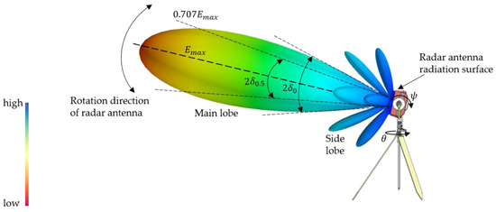 In the equation, and represent the horizontal and vertical angles between the observation point and the radiation direction, respectively; is the directional unit vector; denotes the phase change of electromagnetic waves, varying with distance; is the maximum electric field strength in the antenna’s main radiation direction; is the current amplitude; and is the antenna radiation pattern function, indicating the relative distribution of radiation intensity in the radiation space [32]. As depicted in Figure 7, the antenna directional radiation pattern was constructed using [33]; this illustrates the non-uniform distribution of electric field intensity in the radiation space. In the radiation pattern, the electric or magnetic field consists of multiple lobes, with the main lobe reflecting the antenna’s strongest radiation direction . The angle on either side of the main lobe peak represents the half-power attenuation region, where the power density decreases to half (electric field strength of 0.707). For GPR antennas, the range of half-power attenuation region typically spans approximately 60° to 90°.
