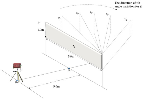 To further analyze the variation in response characteristics of geological structures with different spatial distributions, experiments were conducted using targets with varying tilt angles (Figure 8). Tin foil was selected as target , with dimensions of 1.0 m in height, 5.0 m in length, and 0.002 m in thickness. The antenna was positioned 5.0 m away from target , with its radiation plane initially perpendicular to the plane of . During the experiment, target was tilted at horizontal angles of 0°, 15°, 30°, 45°, 60°, and 75°. The antenna rotated clockwise with a fixed vertical rotation angle of 0°, and horizontal rotation angles were adjusted in 0.2° increments to cover the range from −90° to 90° of horizontal rotation angles.