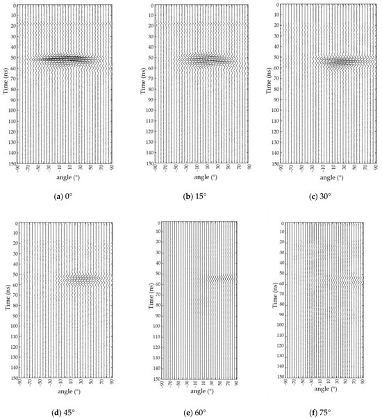 Figure 9a–f respectively show the waveform results when the tilt angle of target varies from 0° to 75°. The data are processed to remove direct waves. Observing the information in the figures, it can be noted that as the tilt angle of target changes from 0° to 75°, the corresponding response area of the target in the waveform also shifts. When the tilt angles are 0°, 15°, 30°, and 45°, the reflection energy is stronger, and the characteristics of the target response in the waveform are more pronounced. However, as the tilt angle increases to 60° and 75°, the reflection energy weakens, resulting in a more blurred response feature. According to the principle of electromagnetic wave reflection, when the receiving surface of the antenna is perpendicular to the reflecting surface of the target, the antenna can receive the reflection energy to the greatest extent [34]. When the tilt angle of the detection target is 0°, its reflecting surface is located at the center of the target. As the tilt angle of the detection target changes, the reflecting surface gradually shifts from the left to the right.