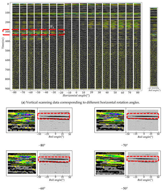 In the processing of raw data, the following steps were taken: (1) zero-point calibration was performed to correct any potential baseline offsets; (2) one-dimensional filtering and Wiener predictive filtering techniques were applied to suppress noise and enhance signal quality; (3) background noise elimination was conducted to further clean non-target signals in the data; (4) wavelet transform was employed to analyze signals at different scales, crucial for identifying and separating useful signal components; (5) considering the relatively weak nature of deep signals and significant differences in gain scales, a power-law gain curve was applied to enhance data accordingly, ensuring signal clarity and resolution [35,36]. It is noteworthy that during filtering, given the antenna’s central frequency of 100 MHz and bandwidth of 100 MHz, cutoff frequencies were set at 50 MHz and 200 MHz to meet frequency requirements for signal processing. As shown in Figure 11, this paper selects the vertically scanned data corresponding to a specific horizontal rotation angle at 10° intervals from the horizontal scanning range for in-depth analysis. Figure 11a presents the bidirectional travel time on the vertical axis and the horizontal rotation angle on the horizontal axis, corresponding to the vertically scanned data at various horizontal angles. The data were conventionally processed, removing direct waves. In Figure 11a, vertical scan data for each group are arranged from −50° to 50° in vertical angles. For each vertical scan angle, 1024 samples within 1000 ns are collected, and these samples are mapped to the RGB color space [37]. As shown in Figure 11, within the color spectrum, colors closer to the center represent lower reflection energy, while colors closer to the ends of the spectrum indicate stronger reflection energy. As the horizontal rotation angle changes from −80° to −10°, a prominent strong reflection zone R3 appears around the 300 ns position, with the reflection energy showing an overall increasing trend. Figure 11b analyzes six groups of vertically scanned data corresponding to horizontal angles from −80° to −30°, with two-way travel times ranging between 290 ns and 320 ns. Notably, within the −40° to 40° vertical scanning range, the anomalous area R3 exhibits energy significantly higher than the background, with uneven energy distribution. Localized strong reflections manifest as fine bright stripes, gradually attenuating from the center to the sides, displaying an energy distribution pattern of “strong in the center, weak on the sides.” The energy variation within the R3 area shows significant regularity, forming high-amplitude, high-frequency reflection wave groups, characterized by uniform waveforms without chaotic reflections or multiple waves. The radar image reveals clear parallel reflective co-phases, which, although slightly inclined, exhibit good continuity. In the −80° to −50° horizontal angle range, the corresponding data response characteristics are pronounced, while features at −40° and −30° weaken. In the R3 region, the average correlation coefficients of strong reflection sub-waves across adjacent detection angles are 98.97%, 99.67%, 97.34%, 89.35%, 81.67%, and 85.35%; the average frequency spectrum similarity is 98.67%, 98.40%, 93.53%, 88.32%, 79.41%, and 74.78%, indicating high similarity of response sub-waves. Furthermore, the characteristics in the R3 area exhibit a linear distribution trend with varying detection angles, forming an overall structure resembling a pea shape, thicker in the center and narrower on the sides. Additionally, the vertical rotation angles of the energy peaks for each group are −1.5°, −2.5°, −5.5°, −10°, −5.0°, and −8.5°.