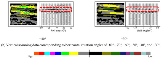 Therefore, it can be inferred that as the antenna rotates (Figure 7), the radiation direction of the antenna also rotates in space around the coordinate axes, leading to a continuous change in the direction of the main lobe radiation. During this process, the central position of the antenna remains stable, and its relative position to the detection target does not change. Furthermore, the reflection wave groups from and exhibit a linear distribution in space (Figure 6b), indicating that the distance from the reflection points to the antenna has not changed significantly. The horizontal rotation angle of the energy peak at is −3.0°, and when the peak energy attenuates to 0.707 times, the range of horizontal rotation angles is −31.8° to 33.6°, which falls within the antenna’s half-power reduction range. Within this range, the reflection wave groups demonstrate a symmetrical distribution characteristic on either side of the energy peak position. Further analysis shows that in the and regions, the average correlation coefficient of the sub-waves at adjacent detection angles reaches 98.97%, with an average spectral similarity of 98.78%. In summary, the formation of the target response characteristics is attributed to the responses generated by wave lobes of varying energy intensities reflecting off the same vertical reflection area during the antenna’s rotation. Since these response characteristics originate from the same reflection area, the reflected sub-waves at different detection angles in the and regions exhibit significant similarity. Moreover, the formation mechanism of and is primarily induced by the antenna’s motion relationships, which also demonstrate an intrinsic correlation in the space of detection angles.