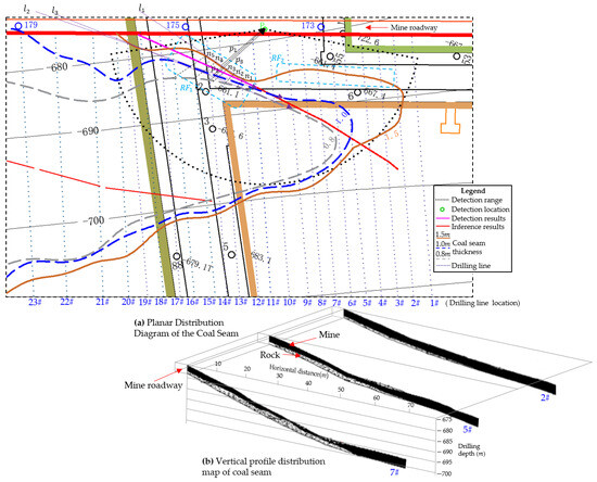 To validate detection results and investigate coal seam distribution in the detection area, drilling operations were conducted to accurately depict coal seam distribution. As shown in Figure 13a, the drilling area measures 150 m in length and 80 m in width, with points 1# to 23# indicating drilling lines on the detection area’s surface. Dense drilling points are found in regions with significant coal seam undulations. Drilling results indicate uneven coal seam thickness distribution in the detection area. Specifically, as illustrated in Figure 13a, brown solid, blue dashed, and gray dashed lines represent contour lines for coal seam thicknesses of 1.5 m, 1.0 m, and 0.8 m, respectively. The contour distribution clearly shows that coal seam thickness within the contours is significantly lower than the average thickness of 3.1 m in other regions, with contours indicating that coal seam thickness decreases from point 1# to point 23#. Figure 13b shows the representative drilling lines 2#, 5#, and 7#, selected to analyze vertical coal seam distribution, with the vertical axis denoting drilling depth and the horizontal axis indicating horizontal distance. It can be observed that rock layers intrude into coal seams from below. On drilling line 2#, coal seam thickness variation is relatively small. However, on drilling lines 5# and 7#, significant coal seam thickness changes occur within the horizontal distance range of 10 m to 60 m. Notably, on drilling line 7#, severe rock layer erosion occurs in the region from 30 m to 55 m, leading to near-extinct coal seams and ultra-thin coal layers. Additionally, along drilling lines 7# to 23#, local coal seam thickness is less than 0.8 m, indicating severe rock layer erosion and the presence of coal–rock boundary regions and coal-free zones.
