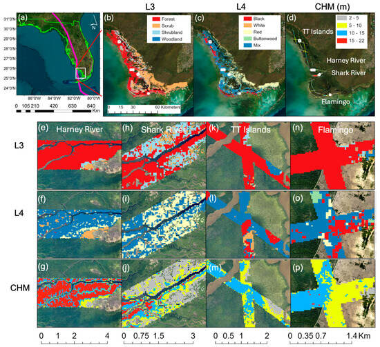 Our study area, located along the southwestern coast of Florida (Figure 1a), covers 1296 km2 of mangrove-dominated vegetation within Everglades National Park (ENP) [10], the largest contiguous protected mangrove forests in the continental USA ([8], Figure 1b). The distribution of mangroves species within ENP varies with inundation frequency and depth and historical hurricane disturbance events (Figure 1c, [38,39,40]). Mixed mangrove assemblages dominate along the coastline and are more frequent than single-species communities (Figure 1c). Previous studies successfully modelled regional CH values in 2000–2004 [8], 2011–2014 [41], and March 2017 [32], all of which showed a similar spatial pattern of CH distribution. Downstream along the Harney River, mangrove forests are dominated by a mixed-species assemblage with relatively tall CH (Figure 1f,g). In the Ten Thousand Islands and Flamingo sites, forests tend to be dominated by mixed-species and black mangrove with intermediate heights (Figure 1l,m,o,p), and upstream, particularly along Shark River, short red mangroves tend to dominate (Figure 1i,j).