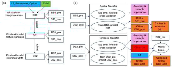 We termed the original dataset covering the entire study area “DS0”, including feature and label variables. For both time periods, every pixel was assigned a label of either a valid CHM value (Figure 1d) or “NaN”. We conducted two levels of data filtering to remove invalid data from “DS0” (Figure 3a). First, we filtered the pixels with valid feature values to generate the “DS1_pre” and “DS1_post” datasets by masking missing values due to cloud cover for the optical images. We further filtered the pixels with CHM values greater than 2 m corresponding to the CH of mangrove species and intersected the filtered pre-Irma and post-Irma datasets to obtain the common pixels, which was termed “DS2”. The DS2 dataset consisted of “DS2_pre” and “DS2_post”, which shared the same locations of pixel samples but with different feature and label values. We primarily used the DS2 dataset for the spatial and temporal transfer learning and DS1 was only used for spatial transfer learning to predict CH for the regional mangrove area (Figure 3).