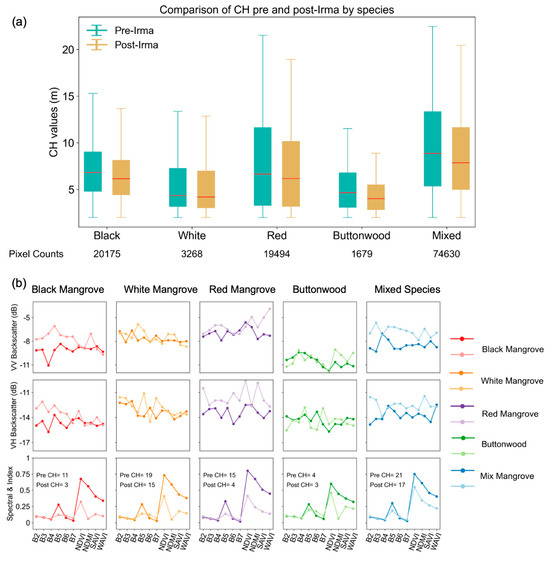 (a) Boxplots for the reference pre- and post-Irma CHM from DS2 dataset. Red line indicates the median value; the boxes represent the interquartile range between the first quartile (25th percentile) and the third quartile (75th percentile); the whiskers extend from the edges of the box to the smallest and largest values within 1.5 times the interquartile range. (b) Comparison of backscatter time series and optical observations using a representative pixel from each species. For each subplot, darker color represents pre-Irma values and lighter color post-Irma values. CH values are displayed in the last row.