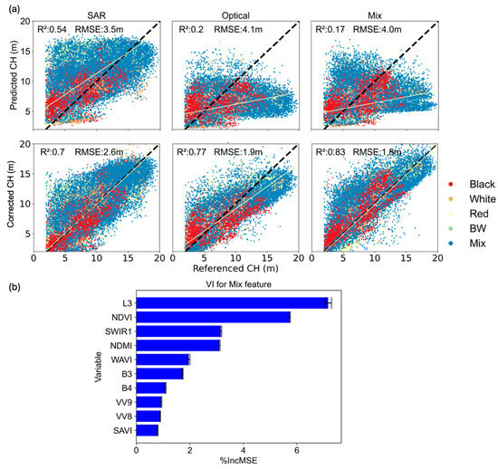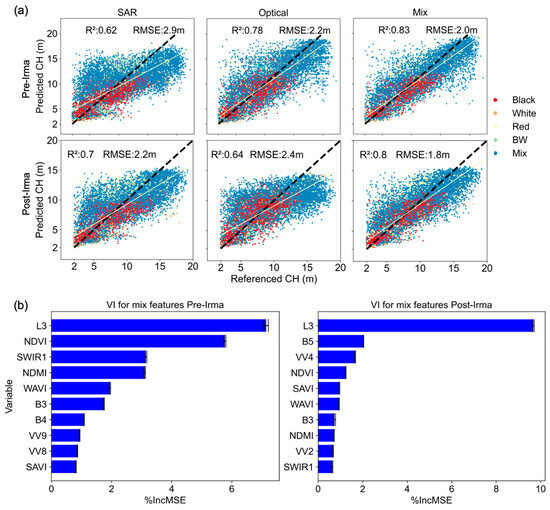 (a) Scatter plot of predicted and referenced CH for pre- and post-Irma from one of the cross-validation evaluation datasets. The yellow lines mark the least-square linear regression model. “BW” in the legend indicates “buttonwood” species. (b) Mean and standard deviation of variable importance of top ten variables using the mixed feature.