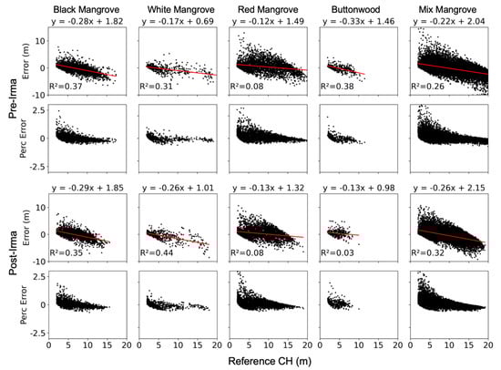 However, uncorrected SAR predictions overestimated CH of short mangroves (Table 5). Changes in SAR backscatter, other than tree height, are likely related to storm-derived sediment deposition and erosion, woody debris accumulations, changes in water surface caused by storm surge, and high precipitation [9,10,11,36,37,60] (Figure 4b and Figure S3). In contrast, optical features achieved high accuracy for short mangroves located farther from the coastline with less branch damage and defoliation (e.g., the buttonwood example in Figure 4b) where observed values were similar between pre- and post-disturbance.
