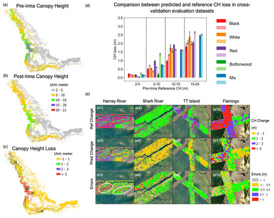 Predicted CH (a) pre-Irma, (b) post-Irma, and (c) CH loss (positive values indicate losses). (d) Comparison between mean and standard deviation of predicted and reference CH loss from evaluation datasets in cross-validation. Deep color represents predicted values and light color reference values. Missing data are due to no pixel samples. (e) Local maps of CH loss. White circles in (e3) indicate (left) the bank areas and (right) the boundary between white and red mangroves according to Figure 1f.