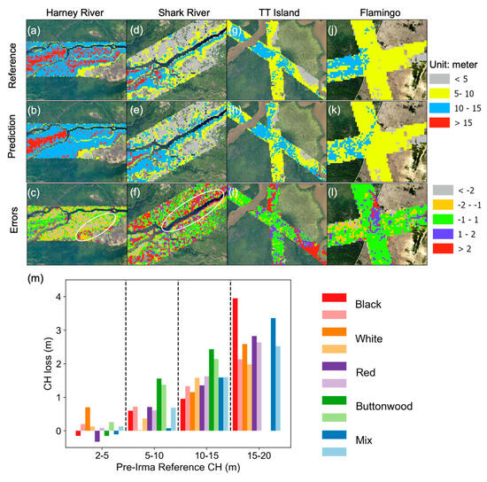 (a–l) Local maps of post-Irma CH reference, corrected predictions, and errors. White circle outlines indicate areas with large errors. (m) Comparison of the corrected predictions and reference CH losses across pre-Irma canopy height and species classes. Deep color indicates predicted values and light color reference values.