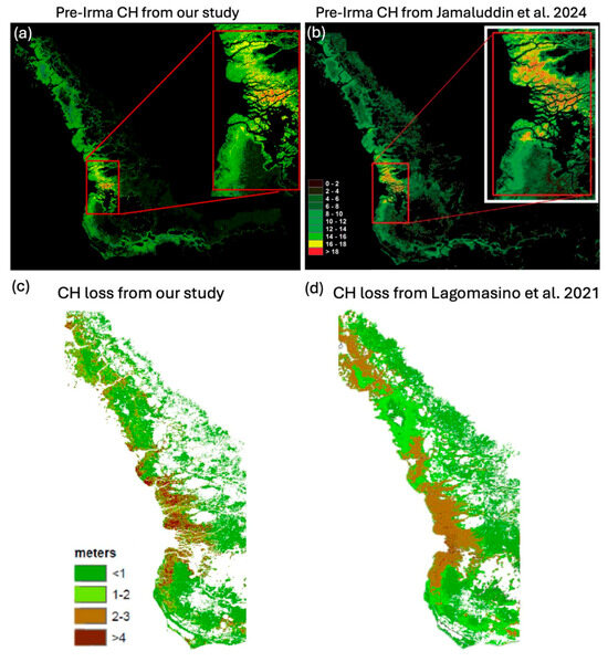 We compared our maps of absolute CH and CH loss with two previous relevant studies by Jamaluddin et al. (2024) and Lagomasino et al. (2021) [10,32]. These studies calculated pre- and post-Irma CH and losses for the mangroves in South Florida using the same G-LiHT datasets for reference as our study.