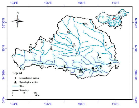 Base precipitation, runoff, and temperature data were provided by the China Meteorological Administration (https://www.cma.gov.cn/ (accessed on 9 July 2022)), Chinese Academy of Sciences, and the Ministry of Water Resources, Soil and Water Conservation Association (http://loess.geodata.cn (accessed on 10 October 2022)). Data (monthly rainfall, day-by-day runoff data, and average temperature) from 13 meteorological stations (Pingliang, Huaxian, Huashan, Tianshui, Wugong, Xiji, Baoji, Xifengzhen, Changwu, Wuqi, Tongchuan, Xi’an, and Luochuan) were obtained from 1961 to 2017. The NDVI had a 1 km resolution, month-by-month NDVI dataset from China (January 2001 to December 2017), produced by a series of processing based on MODIS MOD13A2 data, and contains 264 TIF files (monthly maximum values of NDVI data from January 2001 to December 2017). NVDI data were obtained from the National Science and Technology Infrastructure Conditional Platform’s National Geosystems Science Data Center (http://www.geodata.cn (accessed on 12 March 2023)). To characterize temporal and spatial changes in NDVI, analyze its response to drought, and eliminate the effect of winter snow, vegetation data for the growing season (March–November) were selected from 2001 to 2017. Month-by-month data were masked using ArcGIS software (version 10.2) to obtain vegetation data for the basin. Maximum value synthesis was performed to obtain annual average (growing season) NDVI data.