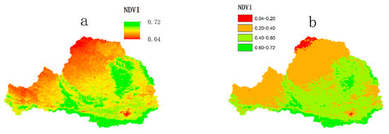 Average NDVI spatial distribution of Wei River Basin, 2001–2017: (a) spatial distribution of NDVI; (b) NDVI grading map.