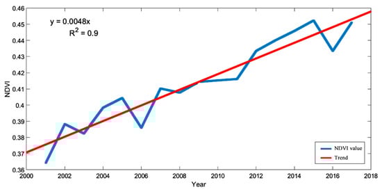 The upward trend (~0.05 decade−1) in annual mean NDVI from 2001 to 2017 is shown in Figure 3. Mean NDVI differs annually, possibly because of climate, but also because of a policy to return farmland to forests.