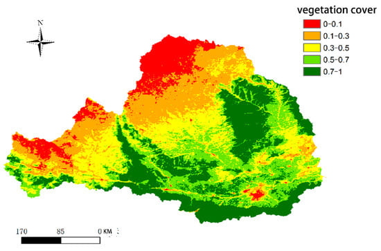 The distribution of average vegetation cover from 2001 to 2017 is shown in Figure 4. Average vegetation cover varies significantly, annually; cover is high in the east and south, and low in the west and north. Areas with higher vegetation cover occur mainly in the northern foothills of Qinling Mountain, and on Liupan, Ziwuling, and Huanglong mountains, where land is mostly forested. Areas with lower vegetation cover occur mainly in barren and sparse grasslands in the northwestern watershed. Vegetation cover throughout this basin may vary because of local natural environments. The climate in the eastern and southern basins is favorable for crop growth, so land cultivation rates and vegetation cover are high (mostly between 0.7 and 1.0); most of the western and northern basins occur on the Loess Plateau, where precipitation is low, the climate is arid, deserts are common, and vegetation cover is low (mostly between 0 and 0.3).