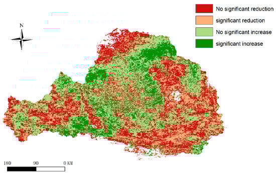 where is the slope of the regression, n is the time span of the study (17 years), i is the ith year among 1–n years, and is the mean value of NDVI in the ith year. Combining the slope of the trend and p-value, the trend in NDVI was categorized as significantly increasing (, significantly decreasing (, or with no significant change (p > 0.05).