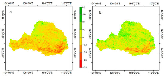 Spatial distribution of r_(SPI-NDVI) (a) and r_(SDI-NDVI) (b) in Weihe River Basin, 2001–2017.