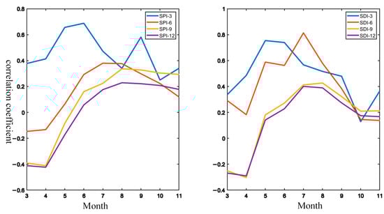 Based on correlation analysis between NDVI, SPI, and SDI data series corresponding to different time scales from 2001 to 2017, the lag in change in vegetation cover in response to drought at different time scales was obtained. Pearson’s correlations between monthly NDVI data during the growing period and SPI and SDI data series for the scale with the largest correlation were obtained.
