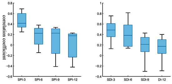 Boxplots of relationships between the effects of drought on vegetation during the growing season at different time scales (3, 6, 9, and 12 months).
