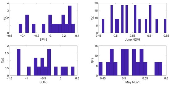 Frequency histograms for SPI-3, SDI-3, May NDVI, and June NDVI.